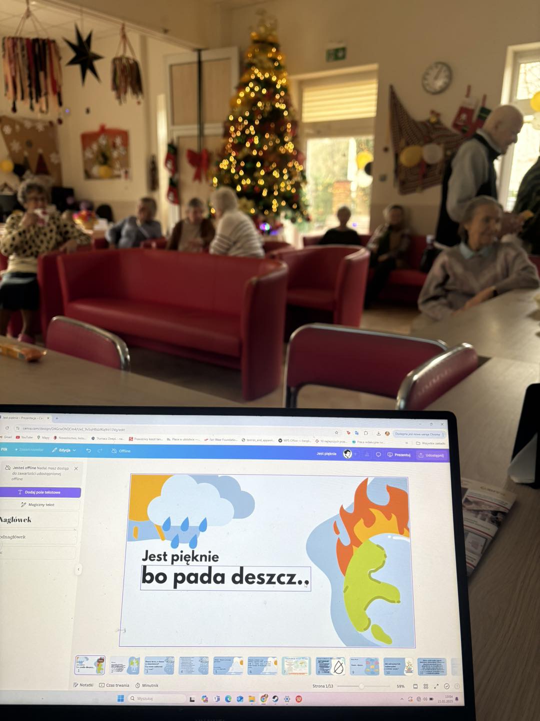 Wczoraj odwiedziliśmy naszych seniorów – kto lepiej pamięta, jak wyglądał świat wiele lat temu? Podczas warsztatów „Jest pięknie, bo pada deszcz'', rozmawialiśmy o globalnym braku wody: według ONZ aż 4 na 10 osób na świecie żyje w niedostatku wody pitnej. Porównywaliśmy sytuację Europy Środkowej i kobiet z Globalnego Południa, aby lepiej zrozumieć, jak zmiany klimatu wpływają na dostęp do wody. Wspólnie przypomnieliśmy sobie, jak deszcz i roślinność wyglądały dawniej, a jak jest teraz. Rozmawialiśmy także o konkretnych rozwiązaniach, które warto wprowadzić, by oszczędzać wodę, takich jak zbieranie deszczówki, korzystanie z ekologicznych urządzeń, ograniczenie użycia wody podczas codziennych czynności czy ponowne wykorzystywanie wody tam, gdzie jest to możliwe. Czytaliśmy inspirujące fragmenty książki Szymona Opryszka „Woda. Historia pewnego porwania” – gorąco polecamy tę lekturę! Na zakończenie warsztatów stworzyliśmy mapę myśli z hasłami „deszcz” i „susza” – to było niezwykle inspirujące!