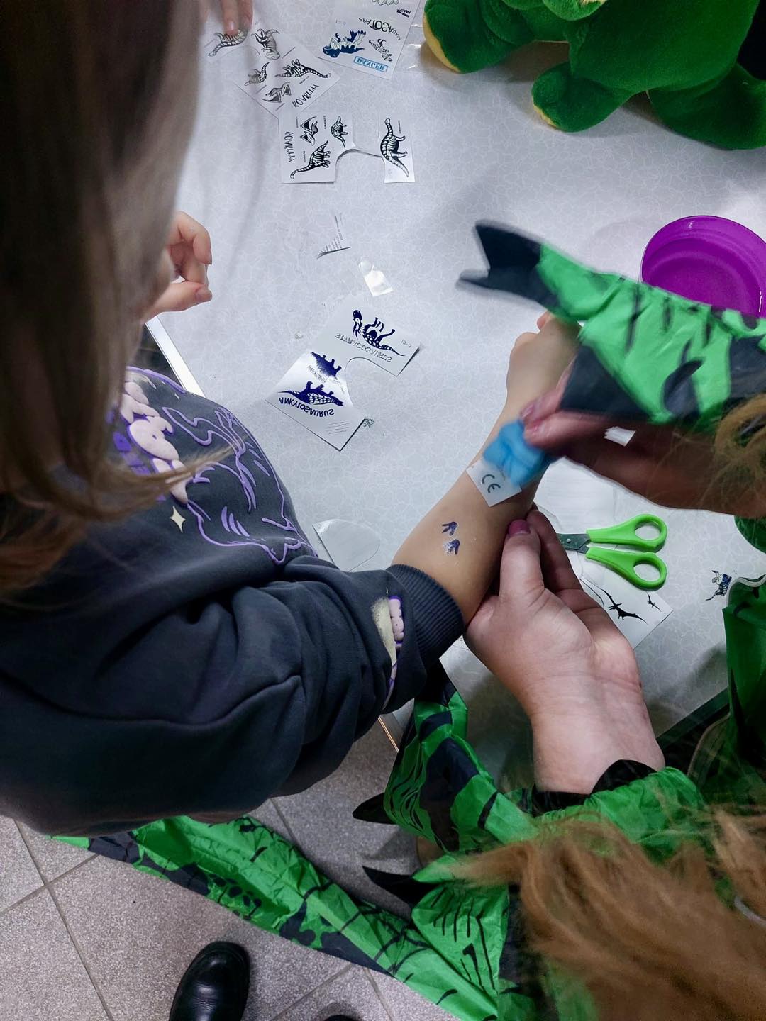 Podczas warsztatów rozmawialiśmy o skamielinach – czym są, jak powstają i gdzie dziś możemy zobaczyć szkielety dinozaurów. Nie zabrakło ciekawostek, pytań i wspólnego odkrywania prehistorycznego świata. Później każdy uczestnik stworzył własną „skamielinę”, a na koniec było jeszcze więcej dinozaurowych atrakcji: tatuaże oraz jajka dinozaurów do rozbrojenia w domu.