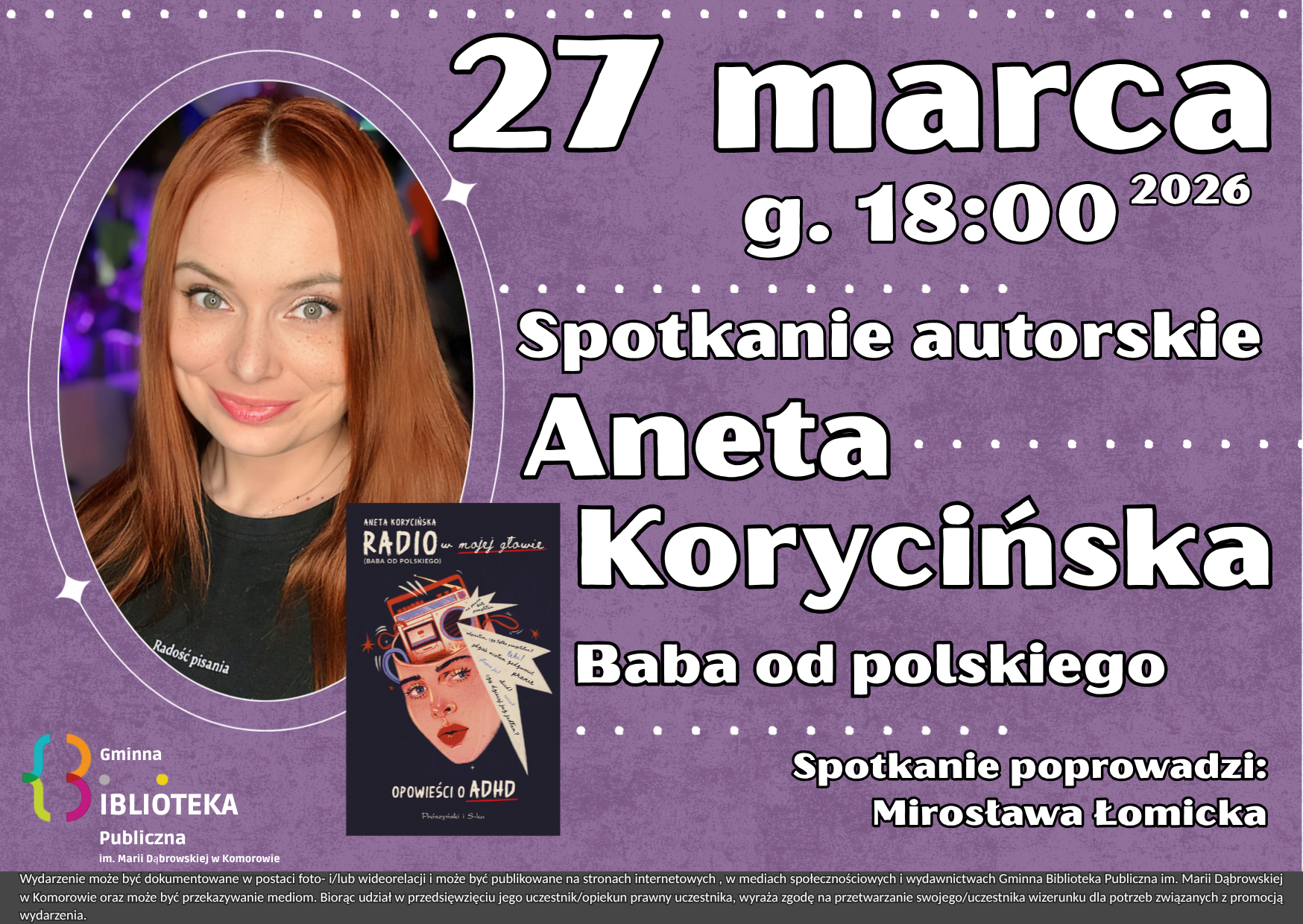 Już 27 marca o godz. 18:00 odbędzie się wyjątkowe spotkanie z Anetą Korycińską, znaną również jako „Baba od polskiego” – cenioną polonistką, popularyzatorką literatury oraz jedną z najbardziej rozpoznawalnych edukatorek w polskim Internecie. Porozmawiamy o literaturze, edukacji młodych osób, a także o książce Pani Anety „Radio w mojej głowie. Opowieści o ADHD”.