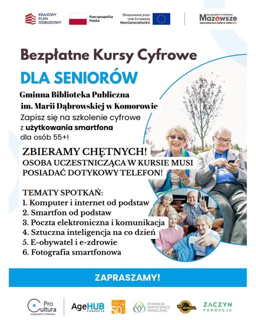 Fundacja Zaczyn oraz Fundacja Age Hub – krajowi liderzy edukacji cyfrowej osób dojrzałych i starszych – z przyjemnością informują o realizacji nowych programów wsparcia. Dzięki nim nasza biblioteka może zostać objęta regularnymi, bezpłatnymi kursami cyfrowymi dla osób 55+.